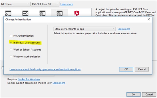 Let's begin our journey. Create ASP.NET Core Web Application project and change authentication to Individual User Accounts.
